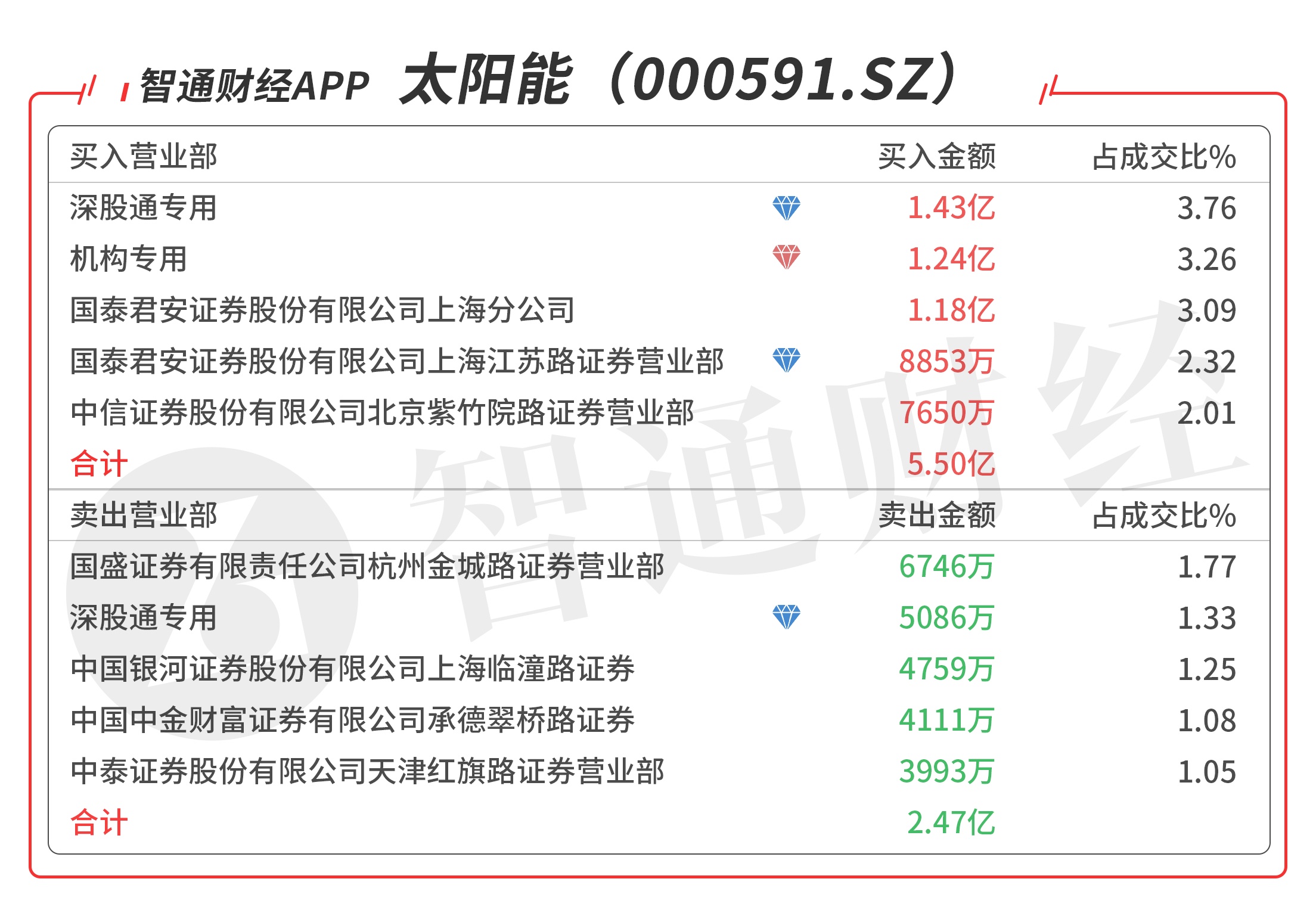 太阳能(000591.SZ):龙虎榜阵容豪华,机构席位买入1.24亿元,深股通对倒净买入9243万元,买四是知名游资章盟主的席位买入8852万元,买五是知名游资跟风高手的席位买入7650万元,当日净买入3.03亿元,该股今日突破所有均线强势涨停,预计有溢价。
