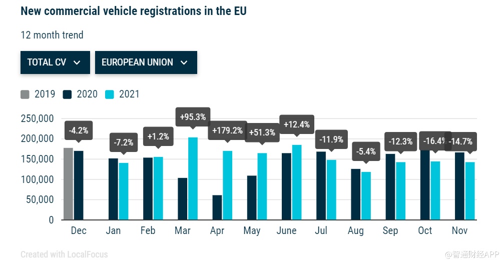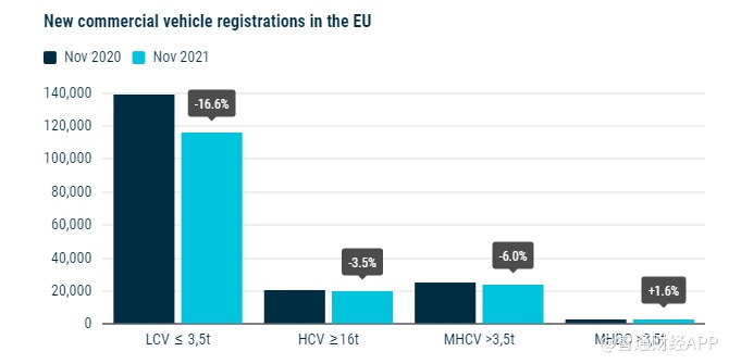 智通财经APP获悉,11月欧盟商用车新注册量下降14.7%至142480辆,为连续第五个月下降。