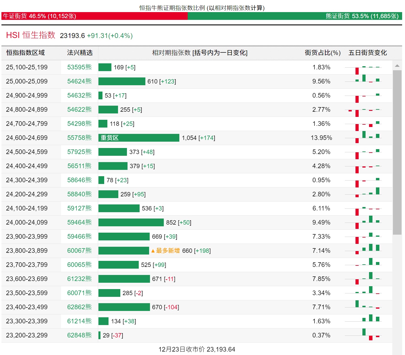 智通财经APP获悉,截至12月24日,恒指最新的牛熊街货比例为47:53。