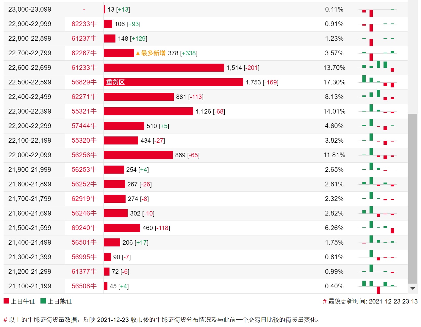 牛证街货重货区在22500-22599区间,该区间最新牛证数量为1753张,较上一交易减少169张;最多新增在22700-22799区间,该区间最新牛证数量为378张,较上一交易日增加338张。