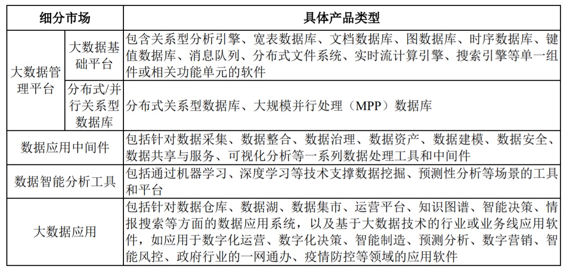 其中,软件产品与技术服务已形成了包括大数据与云基础软件、分布式关系型数据库、数据开发与智能分析工具的软件产品矩阵,覆盖数据的集成、存储、治理、建模、分析、挖掘和流通等的数据全生命周期。