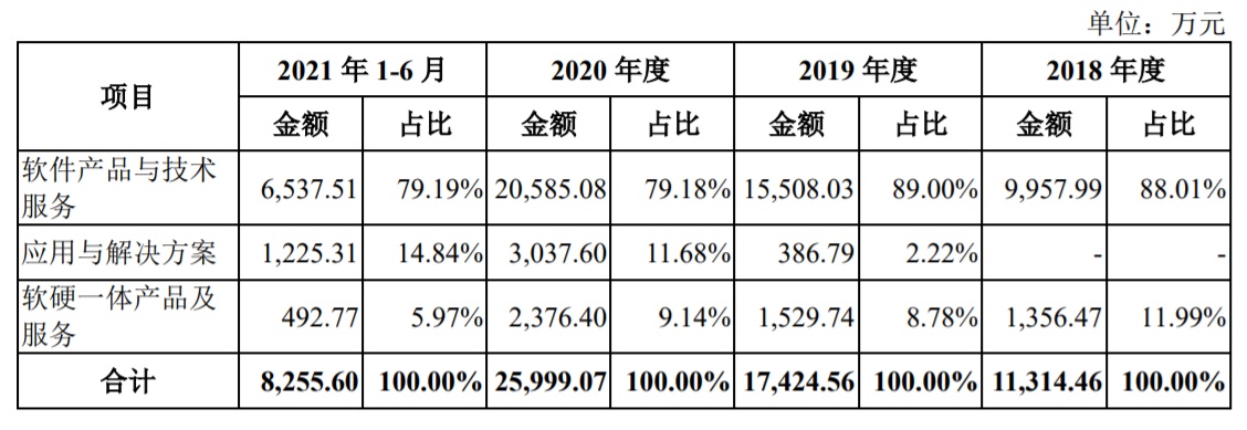 公司的营业收入数据对上述结论也有所佐证。据招股书显示,星环科技目前的收入主要来源于软件产品与技术服务,2020年时,该业务的收入占比高达79.18%,且该业务亦是公司业绩增长的主力,2018至2020年,该业务的收入从9957.99万增至2.1亿元,年复合增速45.6%。