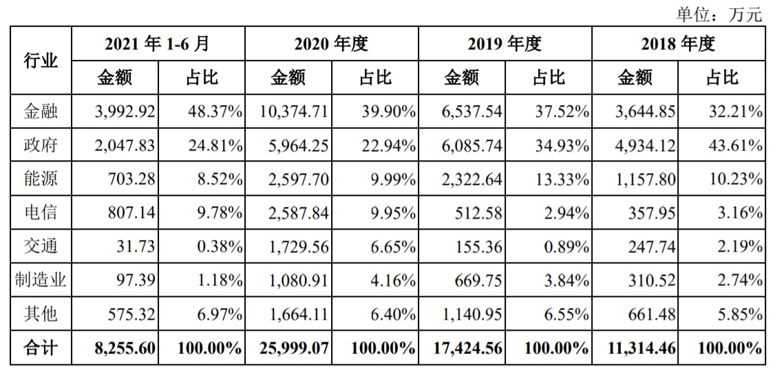 公司的产品已广泛应用在金融、政府、能源、交通、制造等多个行业,截至2021年6月末,其终端用户已超过1000家。产品已落地机构包括金融行业的中国银行、浦发银行、江苏银行、中国太平、中信证券、南方基金等;政府领域的外交部、财政部、市场监督管理总局等;能源行业的中国石油、南方电网等;交通行业的中国邮政、春秋航空等;制造业的中国铝业、沙钢集团、湖南中烟等。