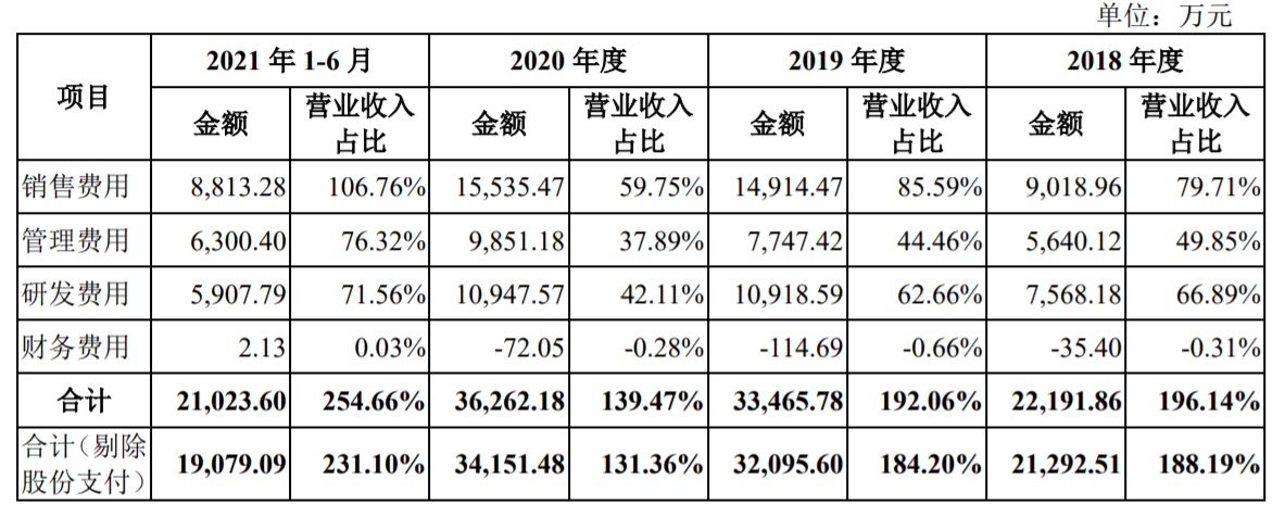 不过,较高的销售费用、管理费用让星环科技业绩承压,使得公司持续亏损。2018至2021年上半年,剔除股份支付后,星环科技的总费用占总收入的比例分别为188.19%、184.2%、131.36%、231.1%。其中,销售费用同期的占比分别为79.71%、85.59%、59.75%、106.76%;同时,管理费用占比亦处于较高水平。