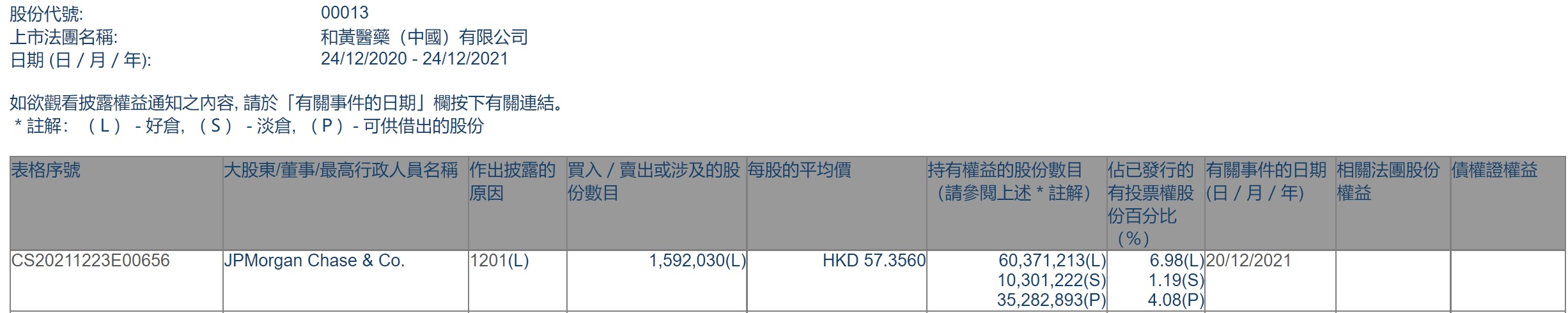 智通财经APP获悉,香港联交所最新资料显示,12月20日,小摩减持和黄医药(00013)约159.20万股,每股作价57.356港元,总金额约为9131.25万港元。减持后最新持股数目约为6037.12万股,最新持股比例为6.98%。