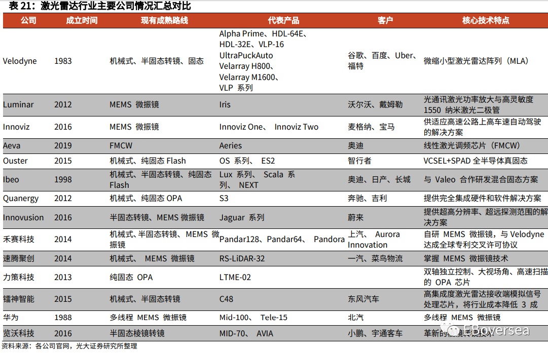 4)在全球范围内选取富有代表性的5家LiDAR厂商Velodyne(VLDR.US)、Luminar(LAZR.US)、Innoviz(INVZ.US)、禾赛科技、速腾聚创,均从公司产品、技术路径、合作伙伴、在手订单与量产进度)几个维度进行核心竞争优势的详细分析和对比。