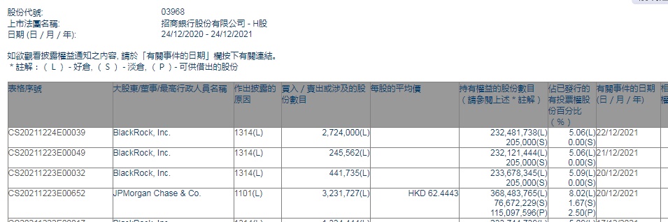 智通财经APP获悉,香港联交所最新资料显示,12月20日,小摩增持招商银行(03968)323.1727万股,每股作价62.4443港元,总金额约为2.02亿港元。增持后最新持股数目约为3.68亿股,最新持股比例为8.02%。