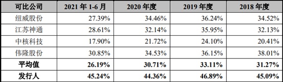 值得关注的是,尽管略显波动,但公司主营业务毛利率分别为45.08%、46.87%、44.35%和45.24%,相较于A股上市可比同业而言毛利率处于较高水平。对此公司解释称,在可比公司中,纽威股份、江苏神通和中核科技主要产品应用领域与其并不相同,对应市场竞争程度相对较高,因此纽威股份、江苏神通和中核科技的毛利率相对低于冠龙的毛利率。