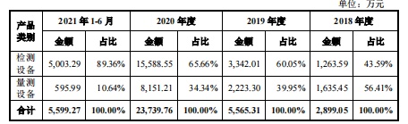 于报告期内,公司检测和量测设备销售收入均呈快速增长,其中检测设备增长尤为突出,收入占比也逐年提升,由2018年的43.59%大增至2021年1-6月的89.36%,主要受到以下两点的影响,一是公司检测设备自2017年通过下游知名客户验证后,口碑效应明显,客户数量快速增长,也带动了设备销量的增长;二是公司持续对各系列设备进行优化升级,逐步进入更高端市场。