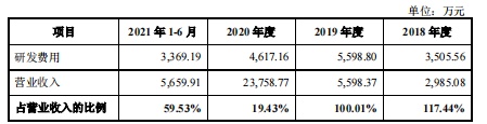不过由于半导体行业更新迭代速度较快,持续的亏损并没有减缓公司对于研发投入的热情。于报告期内,中科飞测维持高强度研发投入。2018年、2019年、2020年及2021年1-6月,公司研发投入分别为3505.56万元,5598.80万元、4617.16万元及3369.19万元,研发费用率分别为117.44%、100.01%、19.43%及59.53%,高于行业均值。公司坦言较高的研发费用率主要是受业务规模较小和持续加大研发投入的综合影响所致。