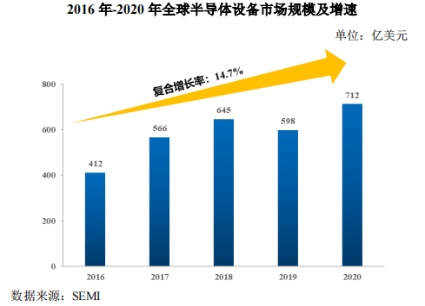 近年来,全球半导体市场对半导体设备的需求稳定增长,全球半导体设备销售的增速明显。根据SEMI的统计,2020年全球半导体设备销售额为712亿美元,同比增长19.1%,预计2021年半导体设备市场仍维持高增长。其中,中国大陆半导体设备的市场规模增速明显,2020年,中国大陆成为全球第一大半导体设备市场,销售额为187.2亿美元,同比增长39.2%,市场占有率快速扩张。
