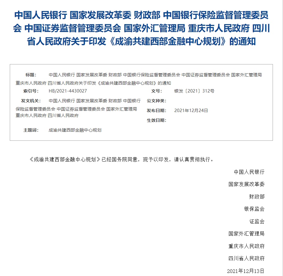 智通财经APP获悉,2021年12月24日,央行等部门联合印发关于《成渝共建西部金融中心规划》的通知。规划提出,到2025年,西部金融中心初步建成。金融体制机制更加优化,金融机构创新活力不断增强,金融开放程度显著提高,辐射集聚能力不断增强,支撑人民币“走出去”的区域战略地位更加凸显,金融生态环境明显优化,金融营商环境居全国前列。现代金融体系更加健全,金融服务“一带一路”建设格局初步形成。科创金融、普惠金融、绿色金融、消费金融、供应链金融等特色金融服务体系更加完善,基本建成中国(西部)金融科技发展高地。