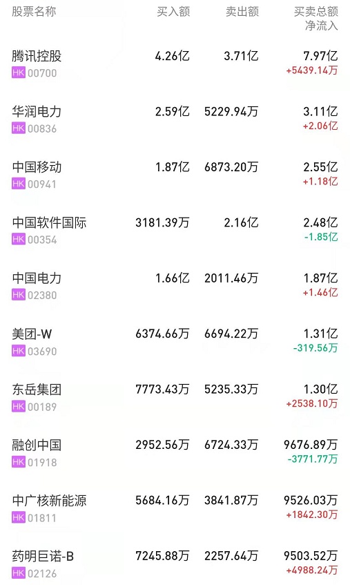 北水净买入最多的个股是华润电力(00836)、中国电力(02380)、中国移动(00941)。北水净卖出最多的个股是腾讯(00700)、工商银行(01398)。