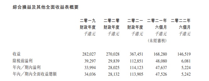 财务方面,于2019年、2020年、2021年及2022年前六个月,公司的收益分别为2.82亿港元、2.70亿港元、3.67亿港元及1.47亿港元。
