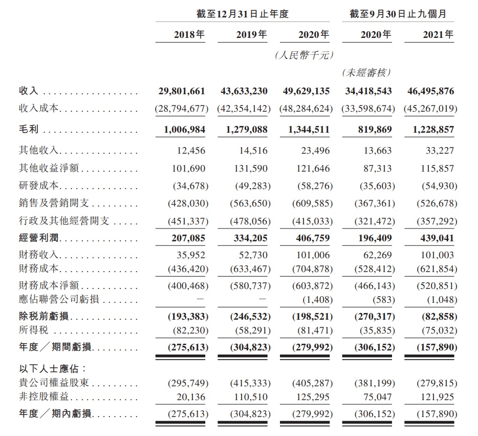 据招股书显示,汇通达收入由2018年的人民币298.017亿元增加46.4%至2019年的人民币436.332亿元,并进一步增加13.7%至2020年的人民币496.291亿元。此外,其收入由截至2020年9月30日止九个月的人民币344.185亿元增加35.1%至截至2021年9月30日止九个月的人民币464.959亿元。