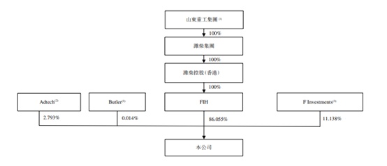 近年以来,在不断底气十足收并购的动作中,法拉帝背后的“参天大树”也逐渐浮出水面。招股书显示,法拉帝在上市前的股东架构中,控股股东为山东重工集团旗下的潍柴集团,通过FIH,持股86.05%。F Investments持股11.138%,Adtech持股2.793%,Butler持股0.014%。
