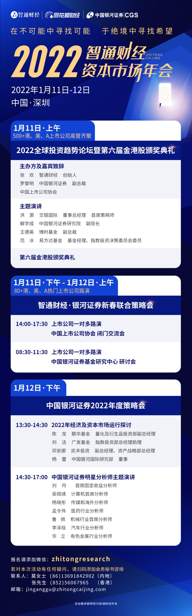 2022年1月11-12日,由国内领先的港美股资讯平台智通财经携手同花顺财经与中国银河证券共同主办,大路演提供全程路演支持的“2022智通财经资本市场年会”将在中国改革开放标志地、粤港澳大湾区战略腹地——深圳隆重启幕。