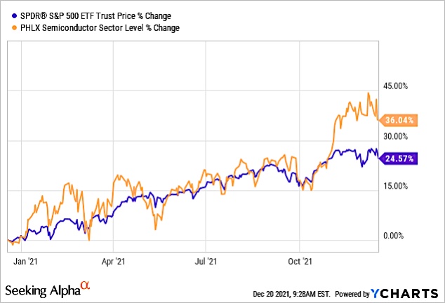 2021年,半导体和半导体设备股票全年增长强劲。下图显示了标准普尔500指数ETF(SPY.US)和费城半导体指数(SOX.US)的表现。