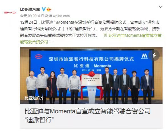 智通财经APP获悉,据比亚迪汽车微博12月27日消息,日前,比亚迪(01211)与Momenta官宣成立深圳市迪派智行科技有限公司。迪派智行将依托比亚迪的智能化技术积淀和垂直整合能力,以及Momenta智能驾驶方面多年的技术积累,打造面向未来的高等级智能驾驶解决方案。