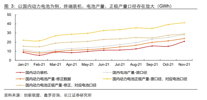 1、即使按锂资源供给制约点计算,2022年动力及储能锂电池产量仍将支撑60%的增长。动力电池属于汽车供应链,供应稳定和库存安全是企业重要的考量,因而“终端需求——动力电池产量——正极产量——资源需求”上存在层层放大的安全库存。根据创新联盟数据,2021年11月国内动力电池装机为20.8GWh,电池产量为28.2GWh;根据鑫椤资讯数据,2021年11月国内三元、铁锂正极产量分别为3.7、4.8万吨,对应电池产量41.3GWh。考虑到存在非动力需求,以及部分电池、正极用于出口,我们大致修正后得到11月动力电池产量较装机量放大约15%,正极材料能够支撑的电池产量较当前电池产量放大约25%-30%。