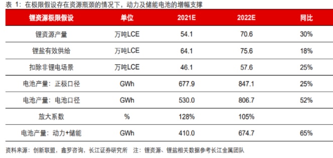 从逻辑上讲,不存在硬缺口的情况下,“终端需求——动力电池产量——正极产量——资源需求”的层层放大会始终存在,但如果考虑锂资源供给存在硬缺口,正极产量的极限是锂资源产量,电池产量的极限是正极产量。2021年锂盐支撑下的正极产量对应电池在680GWh左右,而锂电池实际产量约为530GWh,2022年市场悲观预期锂资源增量16-17万吨,考虑库存调节后的有效供给,对应正极口径支撑的电池产量在850GWh左右,如果存在硬缺口的情况下,正极-电池的放大系数会明显收窄,则锂电池整体的增速将达到50%以上,如果仅考虑动力和储能场景,对应增速在65%左右。因此即使在最悲观的预期下,锂电产业链的增速也是非常可观的。