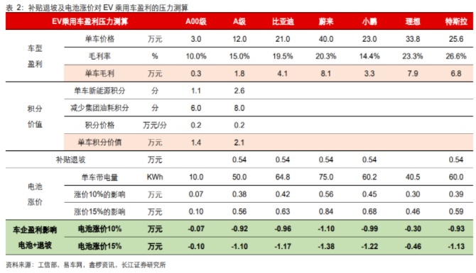 首先对于车企来说,成本占比较高的产线摊销、研发投入和人员费用等均属于固定成本,在单车毛利为正情况下,车企一定会选择放大销量来摊薄成本。我们统计了市场主流电动车企的单车毛利,特斯拉、蔚来、理想的单车毛利在7-8万元,比亚迪、小鹏大约在3-4万元,即使考虑电池成本上涨10%及明年补贴下滑,明年的单车毛利仍然可观。对于其他A00级、A级车型而言,部分车企主要是基于应对双积分的考量,在当前的积分价格下,生产新能源车降低的负激励大约为1.5-2万元,即使补贴退坡、电池涨价,生产新能源车依然是缺积分的传统车企首选。