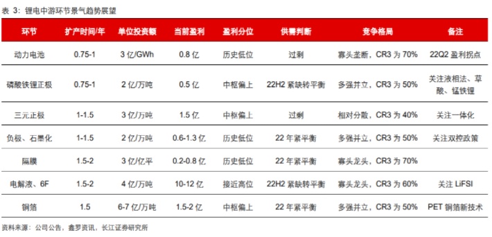 2021年产业链正式迈入全面高景气,确实出现了诸多盈利扩张的环节,所以行业的扩产也在加速,未来供需格局会逐步扭转,但不同环节未来盈利趋势会呈现明显的分化。当前电解液处于盈利高位,三元、铁锂正极,铜箔处于历史盈利中枢偏上的位置。不过可以看到,动力电池和负极材料因成本端上涨2021年盈利能力仍处在历史低位,隔膜同样也是盈利底部,未来单位盈利向下的空间其实不大,甚至因为成本改善、出货结构改善或销量提升存在向上的可能。隔膜、铜箔、负极扩张存在一定的制约,景气持续性可能较长,即使是电解液和磷酸铁锂,在需求高速增长的背景下,相信即使供给释放,盈利能力的回落也是相对有序的,尤其是龙头公司的周期性较弱。