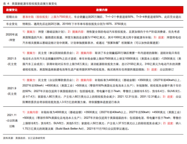 税收抵免政策加码是美国新能源车增长的重要推动因素,其依托于《重建美好法案》于今年11月通过众议院审议,目前在参议院审议阶段,此前基于民主党多数派领袖最乐观的预期,是圣诞节前推动法案落地。但近期民主党内部出现个别议员分歧的声音(针对的是整个重建美好法案,而不是单独针对新能源板块),将导致税收抵免政策落地推迟。