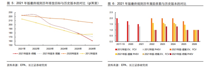 油耗经济性方面,12月20日美国环境署(EPA)发布最终版CAFE油耗经济性政策更新版,较2020年特朗普版本明显加严,较8月预案也有所超预期:1)EPA最终方案确定2026年达到55.0英里/加仑、161g/英里碳排放(2020年版本为43.4英里/加仑、208g/英里碳排放;8月提案为52.0英里/加仑、173g/英里碳排放);且2023年标准较2022年严格10%,2024-2026年每年分别严格5%、7%、10%(8月提案2024-2026年均严格5%)。2)先进技术的激励标准在8月提案中未作调整,最终规则将2022年系数调整为1,2023-2025年为EV 1.5、PHEV 1.3,2025年系数同样为1,较现有方案和预案更加严格,更重要的是该规则的调整,对于2022年也会产生影响。