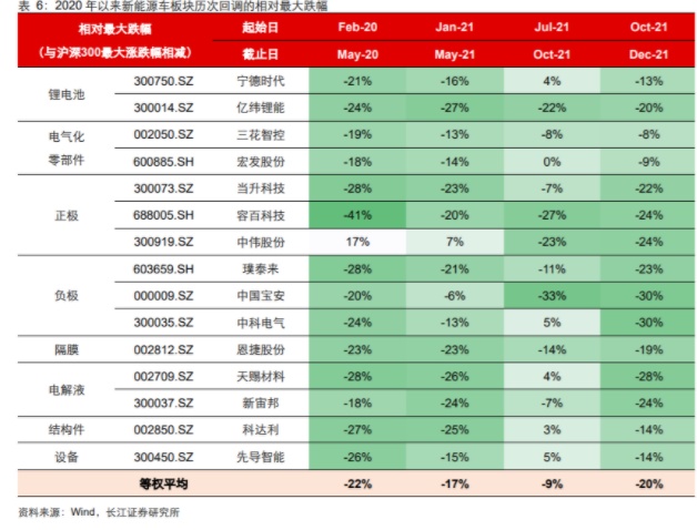 针对市场关注的三个基本面问题,我们作了对应解答,通过上述分析我们对明年整个电动车市场的高增长保有充分信心,那么从投资角度看,当前板块又处在什么位置。我们通过历史跌幅统计和估值分位两个角度进行刻画:一方面,新能源车板块近两年经历过2020年3月、2021年2月、2021年9月以及当前四轮较大幅度的回调,从相对于沪深300的最大跌幅来看,本轮回调的幅度已经达到和2020年3月、2021年2月同一水平,但无论是市场流动性因素,还是基本面的景气预期,当前均要好于过往的两次;另一方面,从估值层面看,当前锂电中游核心标的对应2022年PE为35倍,对应2023年PE为26倍,在2021年4月板块低点时,对应2021、2022年的PE分别为42倍、32倍,考虑到当前已经临近跨年,可以说板块再度处于过去两年估值的最底部。之所以板块年内涨幅明显,而估值没有明显抬升,则是因为新能源车行业基本面持续超预期,且景气预期不断上修(板块今年平均涨幅在50%左右,但板块的业绩增长超过100%)。
