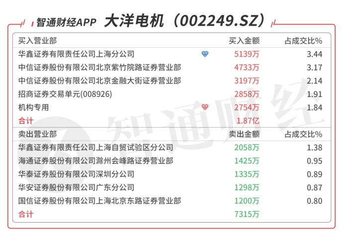 大洋电机(002249.SZ):多主力现身龙虎榜,机构买入2754万元,买一是知名游资的席位买入5139万元,买三是知名游资成泉系的席位买入3197万元,当日净买入1.33亿元,该股今日突破平台强势涨停,预计压力位在前期高点10元附近。