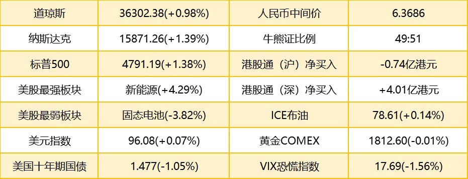 1. 隔夜美股道指涨351.82点,涨幅为0.98%,报36302.38点;纳指涨217.89点,涨幅为1.39%,报15871.26点;标普500指数涨65.40点,涨幅为1.38%,报4791.19点,收于记录新高。港股ADR指数上涨,按比例计算,收报23299点,升75.97点或0.33%。