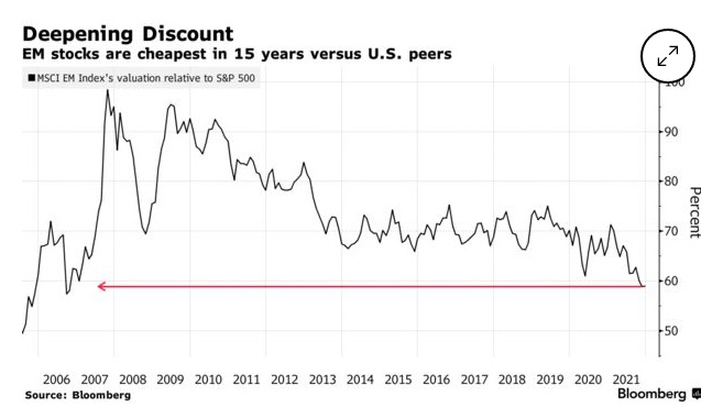 与美国市场相比,新兴市场中的股票是15年来最便宜的