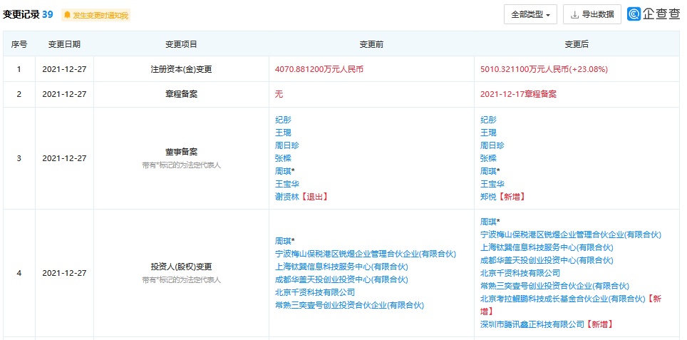 智通财经APP获悉,企查查APP显示,12月27日,上海量锐信息科技有限公司发生工商变更,新增深圳市腾讯鑫正科技有限公司等为股东。
