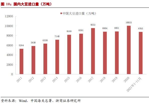 我国是世界上最大的大豆消费国,年消费量在1亿吨以上,主要分为食用和饲用两个相对独立的市场,国产大豆主要用作食品、加工豆制品和大豆蛋白;进口大豆主要用于满足植物油和蛋白粕需求,其中20%加工成油脂,80%加工成豆粕。不足2000万吨的国产大豆难以满足日益增长的消费需求,超80%的大豆消费依赖进口。尤其是近两年养殖业持续快速恢复带动饲用豆粕需求大幅增长,导致进口大豆进口创新高,2020年我国累计进口大豆10033万吨,首次超过1亿吨,进口占比达到83.4%。2021年1-11月大豆进口量8765.3万吨,预计全年进口量在9500万吨左右。
