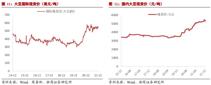国际大豆价格维持高位调整。从国际市场来看,去年全球大豆价格同比上涨20%-30%,主要系主要大豆产区的产量都受到影响:美国大豆产区遭遇不利天气,大豆产量及库存预期下调;南美大豆产区天气仍比较干旱,大豆种植受到影响,引发对南美尤其是阿根廷大豆减产的预期。2021年巴西大豆和美国大豆顺利收货,全球大豆产量预期调增,但仍受到新冠疫情和极端恶劣天气等不确定性因素的影响,全球大豆价格维持在高位震荡。