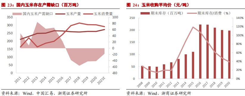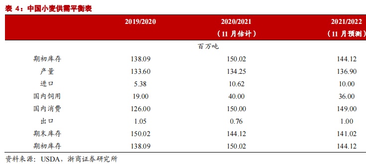 小麦供给保持稳定,2020/2021年度世界产量7.75亿吨,中国产量1.34亿吨,与之前两年产量水平相当,目前小麦库存水平仍处于高位。