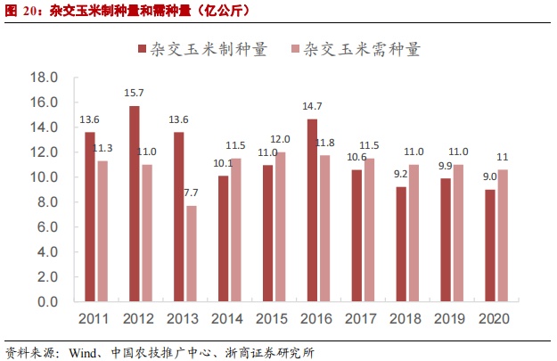 杂交玉米种子供给正在收缩,(1)2021年制种量9.93亿公斤,制种量自2016年以来持续下降,需种量保持稳定,使得库存量不断减少,2021年库存量4.77亿公斤,已接近历史低位。(2)2021年部分制种基地受灾,西北基地受前期低温阴雨和后期高温天气影响,产量较正常年份减少10-15%,较丰收年份减少20-25%;西南基地受收获期连续阴雨天气影响,产量较正常年份减少5-10%,较丰收年份减少10-15%。