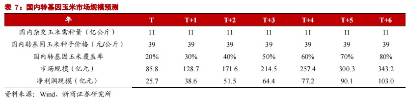 转基因玉米覆盖率提高将带来巨大市场空间。假设国内杂交玉米需种量保持11亿公斤,参考国内杂交玉米种子价格(30元/公斤),若按1.3倍价格来估计成本更高的转基因玉米种子价格(39元/公斤),按30%来估计净利率,假设第T年为转基因品种大规模推广的元年,且覆盖率逐年提升,至第T+6年可提升至80%,对应的市场规模为343.2亿元,净利润规模为103.0亿元。目前,转基因玉米种子已有DBN9936、DBN9858、DBN9501和瑞丰125获得农业转基因生物安全证书,该行认为这方面具有先发优势的大北农、隆平高科具有投资价值。