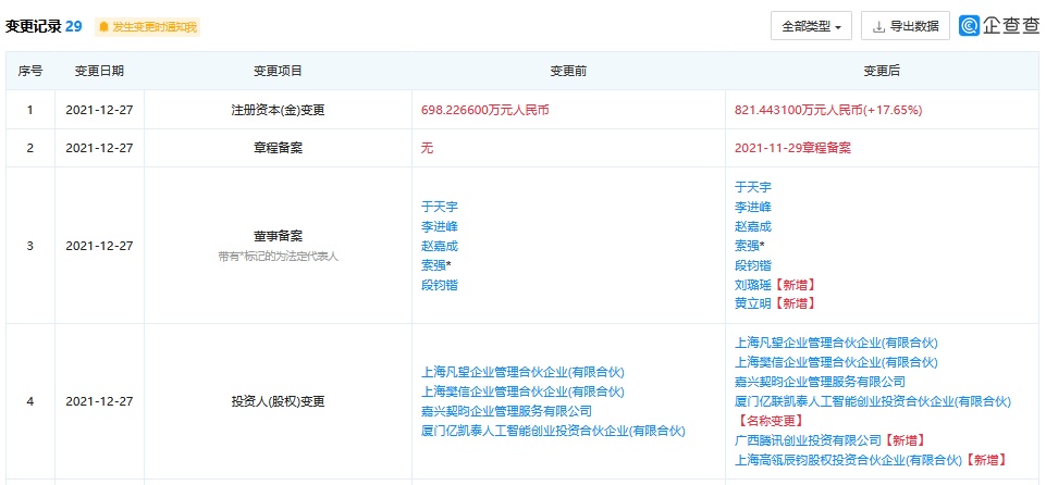 智通财经APP获悉,企查查APP显示,12月27日,上海望繁信科技有限公司发生工商变更,新增股东广西腾讯创业投资有限公司,同时公司注册资本由698.23万元人民币增加至821.44万元人民币,增幅为17.65%。