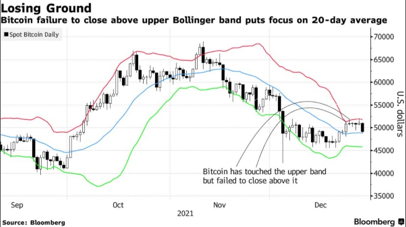 技术研究表明,11月比特币从近69000美元的历史高点回落后,出现了某种转折点。根据布林线指标(Bollinger Bands)进行的研究显示,比特币在过去一周曾触及布林带上波带,但未能超过上波带。对一些人来说,这意味着比特币在短期内可能难以上涨。