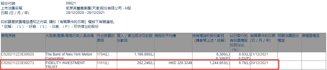 智通财经APP获悉,香港联交所最新资料显示,12月20日,FIDELITY INVESTMENT TRUST增持凯莱英(06821)26.2246万股,每股作价320.3249港元,总金额约为8400.39万港元。增持后最新持股数目为124.47万股,最新持股比例为6.76%。