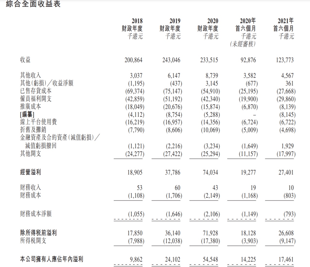 截至2020首六个月-2021首六个月止财年,公司营收分别约为9287.6万港元及1.24亿港元,该期间归属于公司拥有人的盈利分别为1422.5万港元及1746.1万港元。