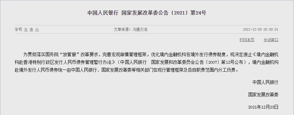 智通财经APP获悉,12月28日,中国人民银行和国家发展改革委发布公告称,为贯彻落实国务院“放管服”改革要求,完善宏观审慎管理框架,优化境内金融机构在境外发行债券制度,现决定废止《境内金融机构赴香港特别行政区发行人民币债券管理暂行办法》(中国人民银行 国家发展和改革委员会公告〔2007〕第12号公布),境内金融机构赴境外发行人民币债券统一由中国人民银行、国家发展改革委等相关部门在现行管理框架及各自职责范围内分工负责。