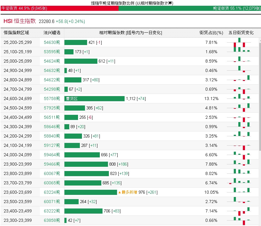 法兴恒指牛熊证街货分布图中的数据显示,熊证街货重货区在24,600-24,699区间,该区间最新熊证数量为1,112张,较上一交易日增加74张;最多新增在23,600-23,699区间,该区间最新熊证数量为976张,较上一交易日增加261张。