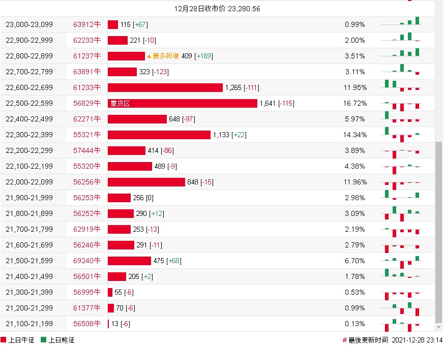 牛证街货重货区在22,500-22,599区间,该区间最新牛证数量为1,641张,较上一交易减少115张;最多新增在22,800-22,899区间,该区间最新牛证数量为409张,较上一交易日增加169张。