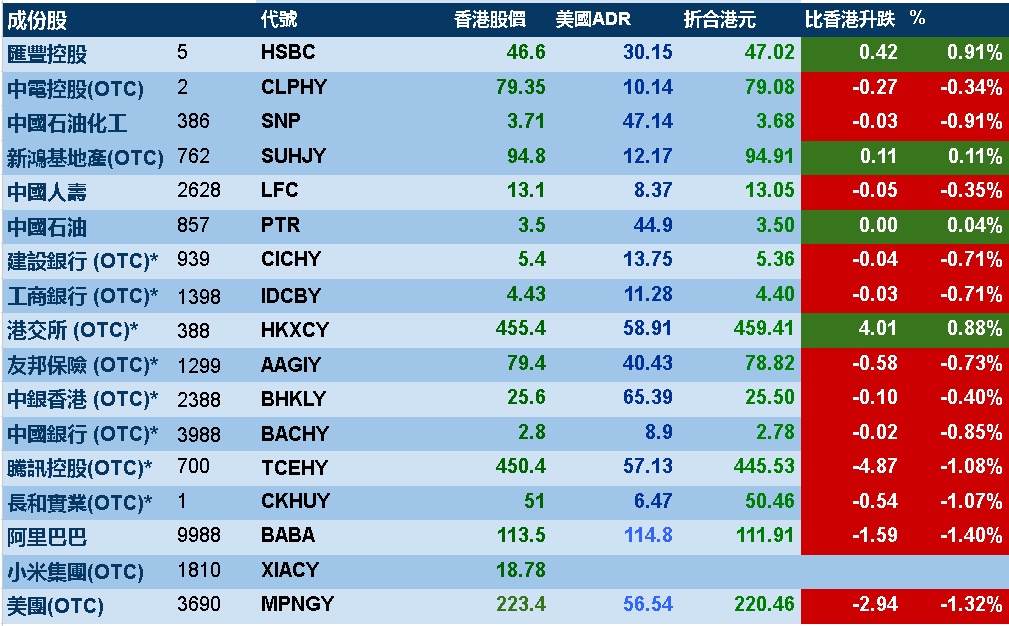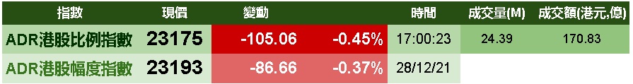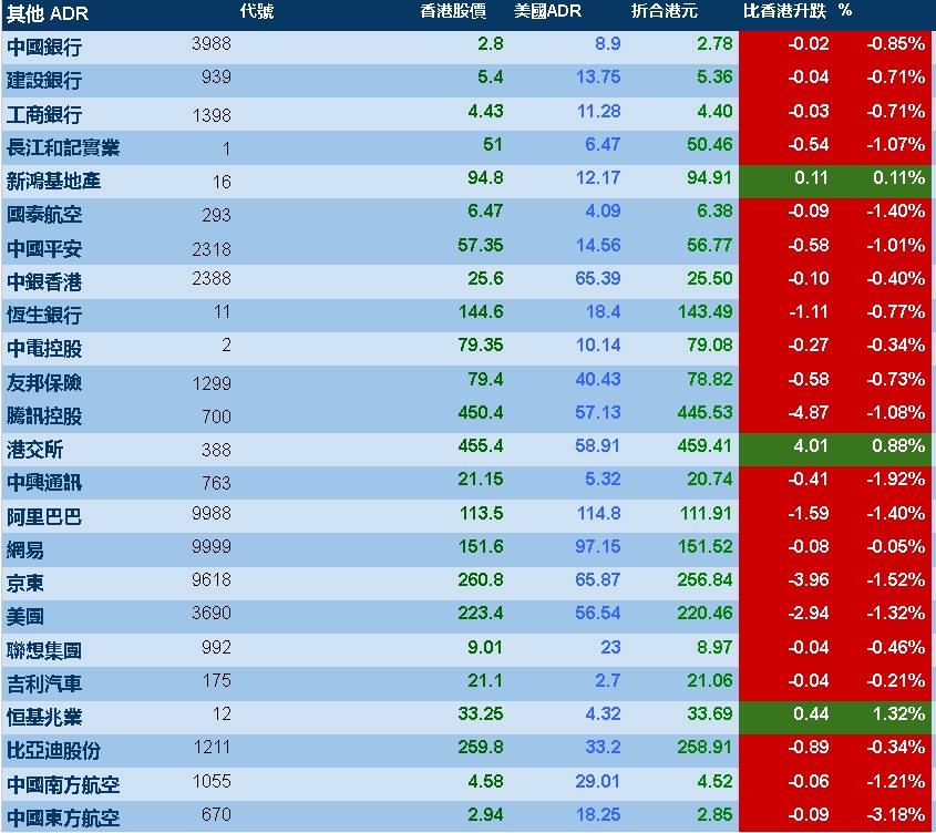 智通财经APP获悉,周二美股三大指数涨跌不一,港股ADR指数下跌,按比例计算,收报23175点,跌105.06点或0.45%。