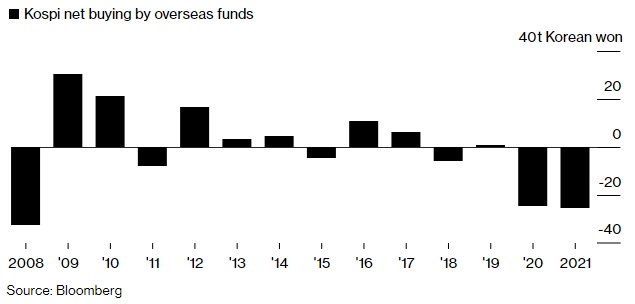 自2008年金融危机以来,外国基金有望成为今年韩国综合股价指数成分股的最大净卖家,他们在2020年和2021年总共抛售了价值约50万亿(约合420亿美元)的股票。