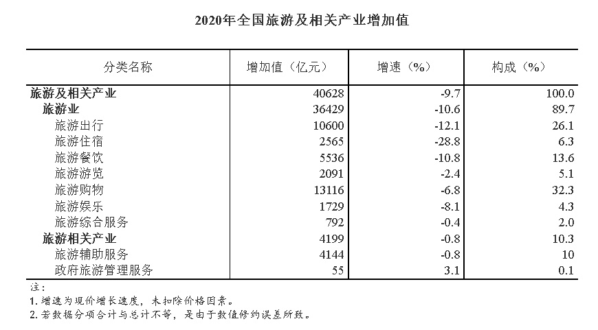 经核算,2020年全国旅游及相关产业增加值为40628亿元,比上年下降9.7%(未扣除价格因素,下同),占国内生产总值(GDP)的比重为4.01%,比上年下降0.55个百分点。