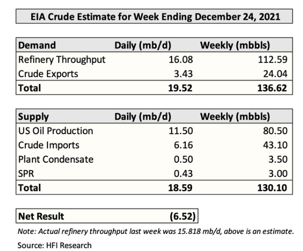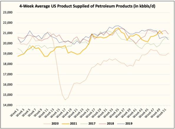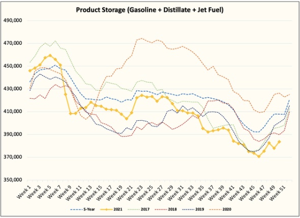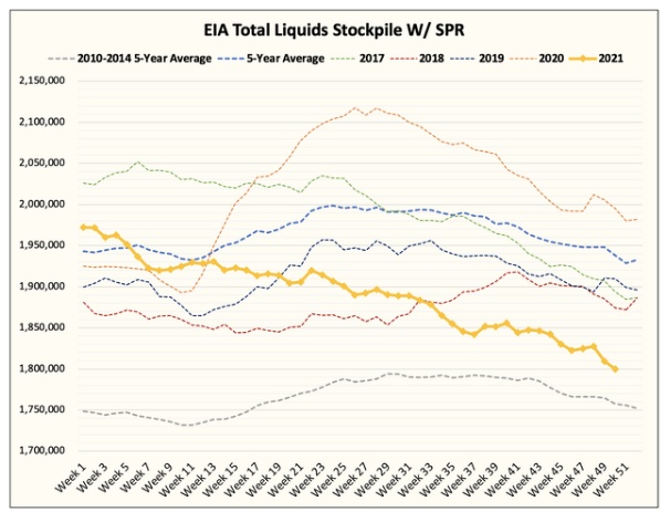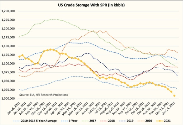 而在最后,美国原油储备或许是油价走高的最有利佐证。下图表明,在2021年,美国原油储存一路走低。截至12月24日,本年度库存量已低于5年年均库存量,处于最近5年内最低的水平。